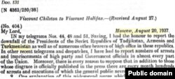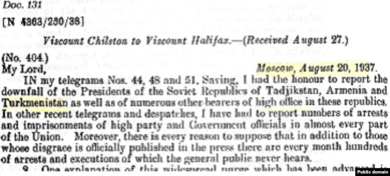 Britaniýanyň Moskwadaky ilçisiniň Londona ýollan telegrammasynda Türkmenistanyň liderleriniň wezipelerinden boşadylyp tussag edilendigi barada habar berilýär. . (British Documents On Forgien Affairs (1917-1939) Part II. Vol.14 University Publicatıons of America)