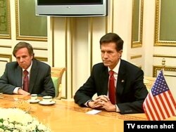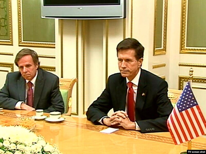 ABŞ-nyň resmileri Robert Bleýk (sagda) we Maýk Pozner prezident G.Berdmuhamedow bilen duşuşykda, 14-nji iýun, Aşgabat