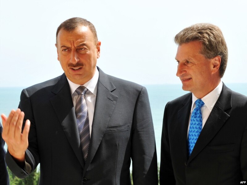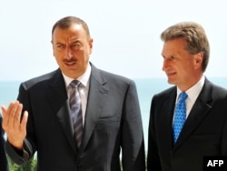Azerbaýjanyň prezidenti Ylham Aliýew (çepde) we ÝB-niň energiýa komissary Gunter Öttinger Bakuwda, 12-nji awgust, 2009-njy ýyl.
