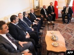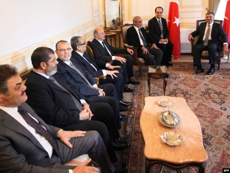 Türkiýäniň prezidenti Abdullah Gül (sagda) «Musulman doganlygy» guramasynyň liderleri bilen duşuşýar, Kair, 3-nji mart 2011-nji ýyl.