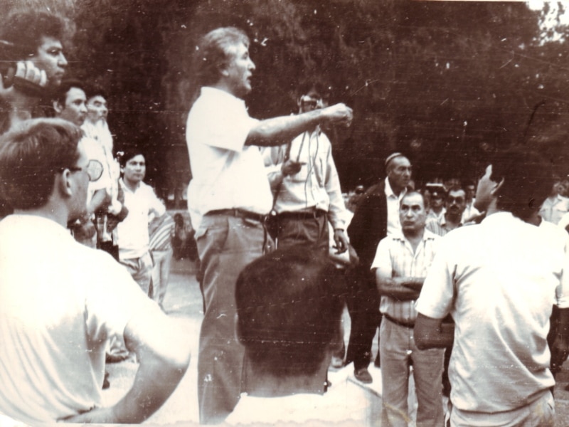 Türkmenistanyň intelligensiýa wekilleri Aşgabatdaky Magtymgulynyň heýkeliniň öňünde miting gurnaýar, 1991-nji ýylyň 27-nji awgusty.
