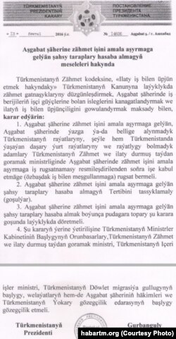 “Türkmenistanyň Alternatiw habarlary” neşiri “Aşgabat şäherine zähmet işini amala aşyrmaga gelýän şahsy taraplary hasaba almgayň meseleleri hakyndaky” prezident G.Berdimuhamedowyň kararydygy aýdylýan dokumenti çap etdi.