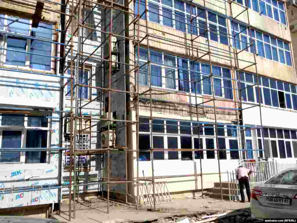 Aşgabadyň Olimpiýa şäherjiginiň gabat garşysyndaky Parahat-1 we Parahat-2 mikroraýonlaryndaky 4-5 gatly jaýlaryň ýüzünden split kondisionerleri aýrylyp, tamlaryň daşy mermere çalym edýän, ak reňkli alfogon materialy bilen örtülýar.