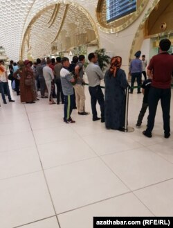 Aşgabadyň halkara aeroportunda “dosadka”, ýagny uçara münmedik ýolagçylaryň deregine bilet satyn almak üçin garaşýan adamlaryň uly nobaty emele geldi.