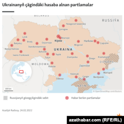 Paýtagtda we onuň Boryspil howa menzilinde bolan partlamalar, atyşyklar we sirena esleri barada habar berildi, Harkow, Kramatorsk, Dnipro, Mariupol, Odessa we Zaporižýe şäherlerinde hem şaýatlar irden partlamalaryň bolandygyny habar berdiler.