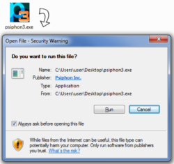 Müşderi programmasyny göçürip alyp, ony işlediň. Ony işledeniňizde, bu programmanyň Psiphon Inc. kompaniýasynyň kanuny önümidigini görkezýän howpsuzlyk sowalyny görersiňiz.