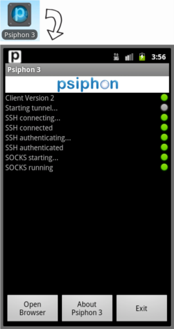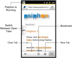 Programma tora birigeninden soň ol öz içindäki Psiphon brauzerini işe goýberýär. Android üçin Psiphon 3 gelýän we gidýän mazmuny öňünden kabul edilen Android brauzeri ýa-da beýleki programmalar üçin awtomatiki amala aşyrmaýar.