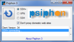 Psiphon 3-i işledeniňizde ol awtomatiki birigip başlaýar. Birigýärkä, pyrlanýan kiçi belgi görkezilýär. Aşakdaky ötük rejeleriniň birini saýlap bilersiňiz: VPN (IPSec üstünde L2TP ), SSH ýa-da SSH+ (SSH goşmak perde, protokolyň barmak yzy alynmaz ýaly SSH-iň ýokarsynda tötänleýin gatlak).